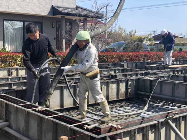 基礎全体を一度に生コン打設し、完全に一体化させることでコンクリートに継目がなく強度が増します。 |